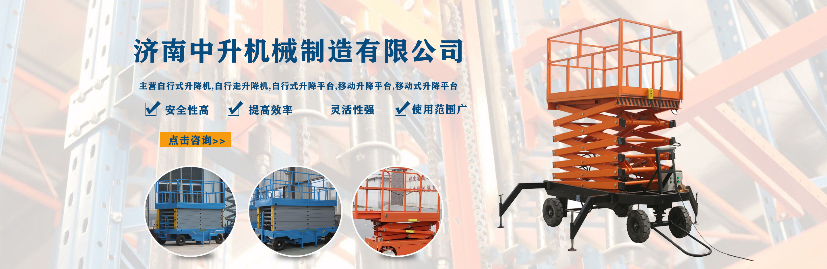 濟南中升機械制造有限公司主營自行式升降機,自行走升降機,自行式升降平臺,移動升降平臺,移動式升降平臺等產品,產品廣泛用于廠房維護、工業安裝、設備檢修、物業管理、倉庫、航空、機場、港口、車站、加油站、體育場、展覽館等多種行業和場所, 公司設備精良、工藝合理、檢測手段齊全,技術力量充足,公司創立伊始即本著“專注、專心”的經營理念,依托技術團隊優勢和設備硬件保障,全力打造良心的升降平臺企業?! ∥夜臼冀K以“品質為本,服務至上”作為企業宗旨。只要你訂購了我公司的產品,無論你身處何方,我們都會及時派出技術人員為你服務!...